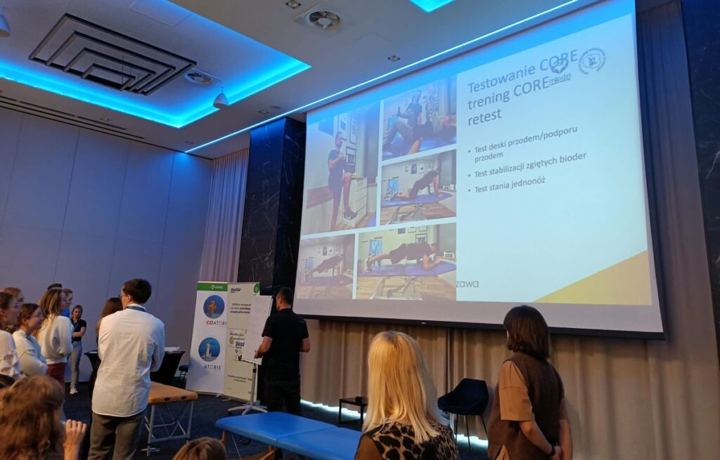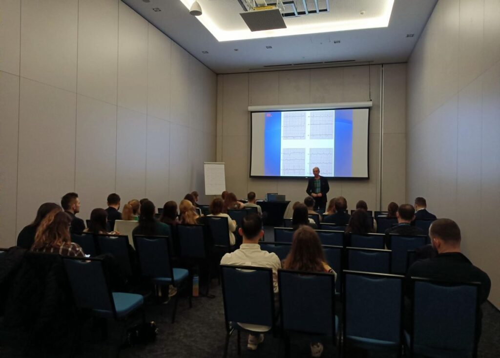 Drugi dzień zaczął się wspólną aktywnością fizyczną — idealnie, by rozruszać się po intensywnej sobocie. Potem nadszedł czas na dwie tury warsztatów. Każdy mógł wybrać to, co najbardziej go interesuje. Kręgosłup L-S w (nieoszukanej) praktyce, sala warsztatowa wyglądała jak rasowy gabinet fizjoterapeutyczny z niezbędnymi kozetkami i matami do wzajemnego badania. EKG w interaktywnej formule, czyli Profesor Tomasz Tomasik niczym Krzysztof Ibisz w „Awanturze o kasę” prowadził drużynowy teleturniej na najlepszą znajomość opisywania zapisów elektrokardiogramów. A na warsztacie poprowadzonym przez grupę MLR Wypalenie zawodowe można było szlifować różne style komunikacji w sytuacjach z codzienności w naszych praktykach, jak się okazało temat wcale nie prosty. Praca w małych grupach, dużo przykładów, dużo ćwiczeń, czyli tak jak warsztaty z prawdziwego zdarzenia powinny wyglądać.